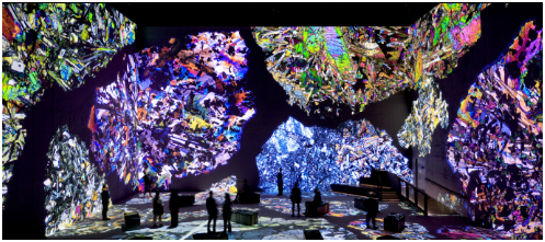 예를 들어, 벽, 바닥, 천장까지 모두 영상, 소리, 빛 등으로 꾸며져 있어 관객이 그 안을 걷고, 보고, 들으며 마치 다른 세계에 들어온 것처럼 느낄 수 있습니다.